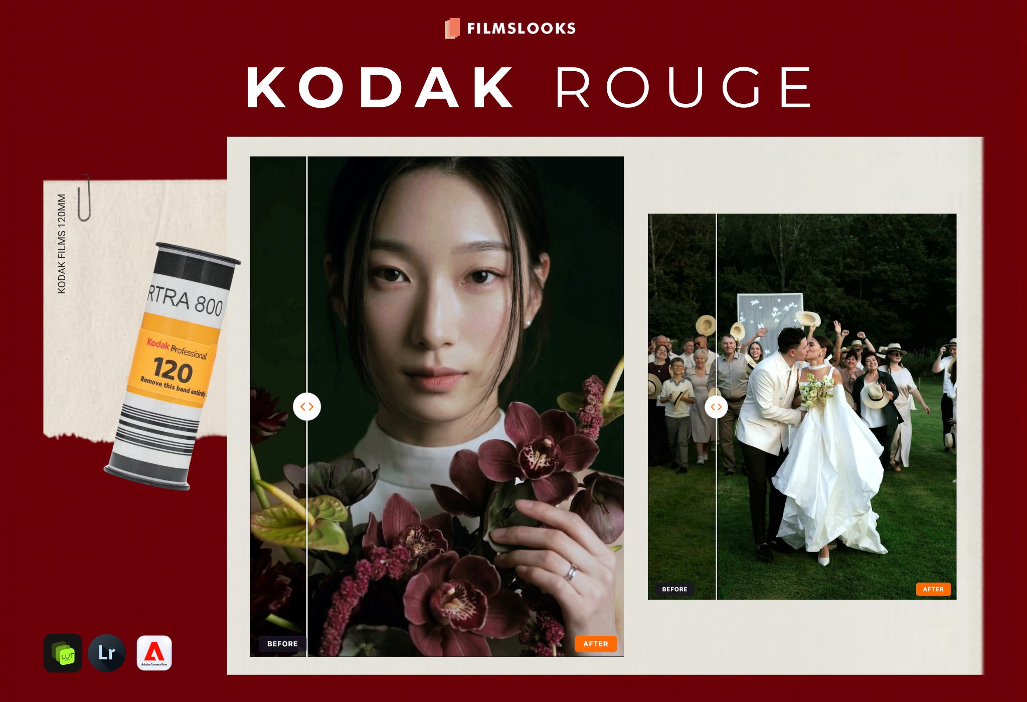 FILMSLOOKS KODAK ROUGE includes 15 Kodak film color profiles used for all digital cameras and flexible for weddings, portrait & fashion in both indoor & outdoor lighting conditions.